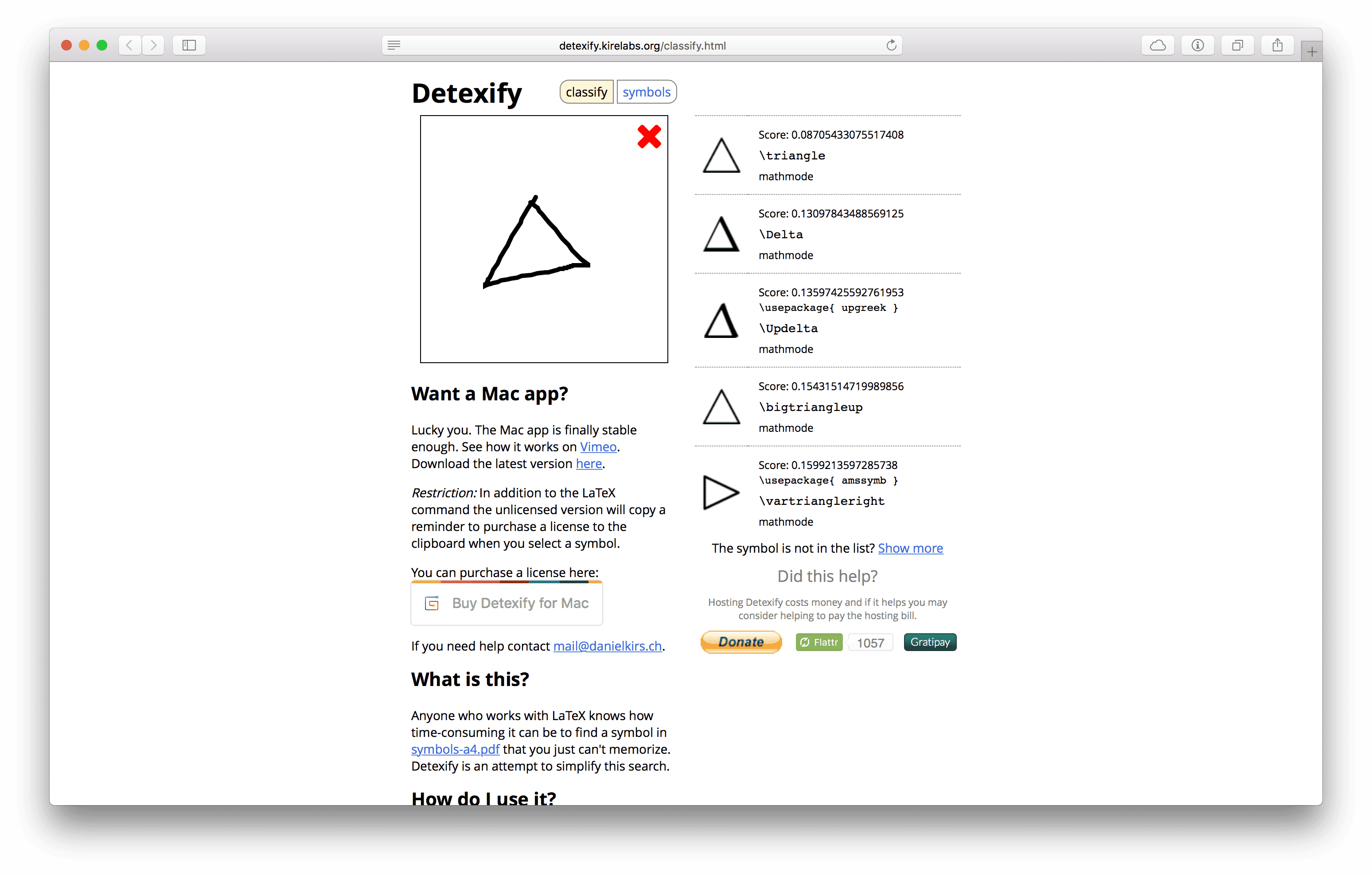 Super useful if you have to use a math symbol but don’t know the LaTeX command for that symbol. Instead of searching the name of the symbol (assuming you know its name), or looking through a list of mathematical symbols and its corresponding LaTeX command in O(n) time, Dextexify allows you to draw the symbol and returns with a list of matching symbols and commands.